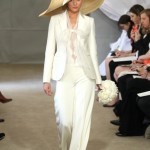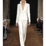 Designers such as Douglas Hannant and Sarah Jassir have designed fitted, sexy wedding tuxedos that cater to a decidedly womanly woman. Sleek jackets and lean trousers in creamy shades of ivory worn with towering heels and lacy camisoles or cheeky bare skin is their choice. Hannant designs them for women he feels are looking to make an unconventional statement. He clarified, “It’s a chic alternative for the bride.” His ideal is to keep it slim and simple. Accessorize with just a pair of diamond studs and killer heels.