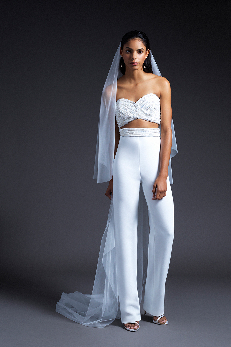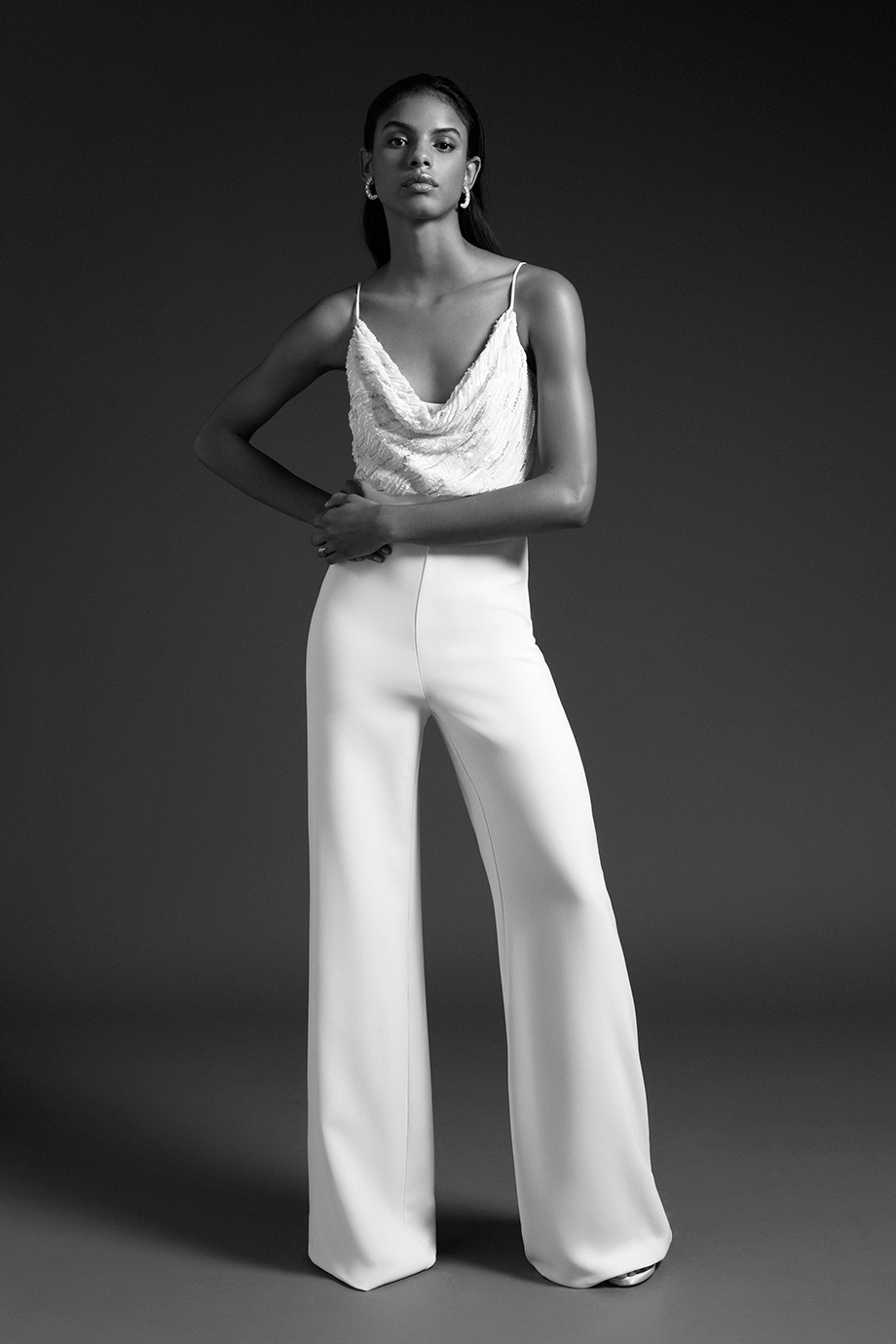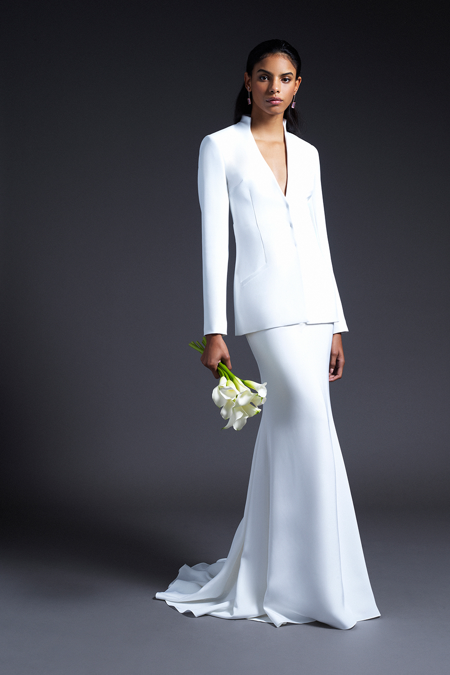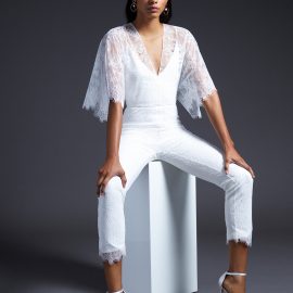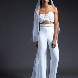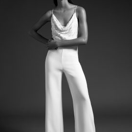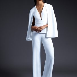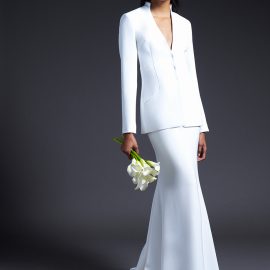 Cushnie Bridal officially debuted during New York Bridal Fashion Week earlier this month and the collection is filled with feminine details and modern silhouettes. No traditional gowns here. The collection not only includes silk gowns with a range of necklines—strapless V-neck, long-sleeved, off-the-shoulder—but also white jackets, trousers, and tops, some of which comes with subtle beading, pearl trim, or Chantilly lace. The Cushnie Collection has pieces that would work for a variety of weddings: a jumpsuit to change into after a the ceremony, or simply to wear to City Hall. The collection also includes options for the bridal shower, rehearsal dinner, and reception.