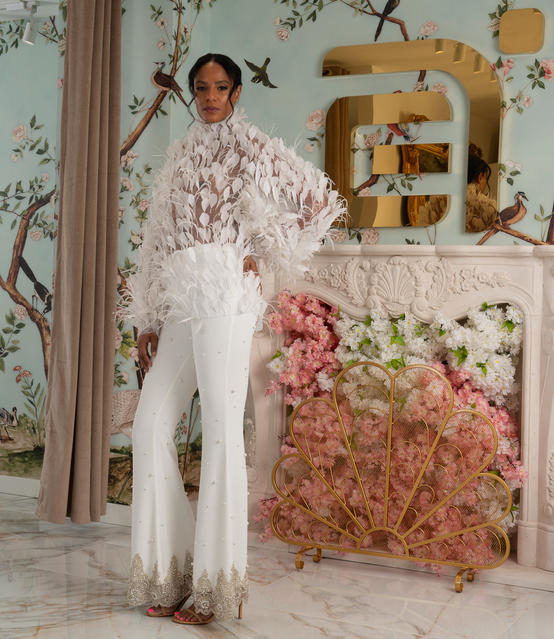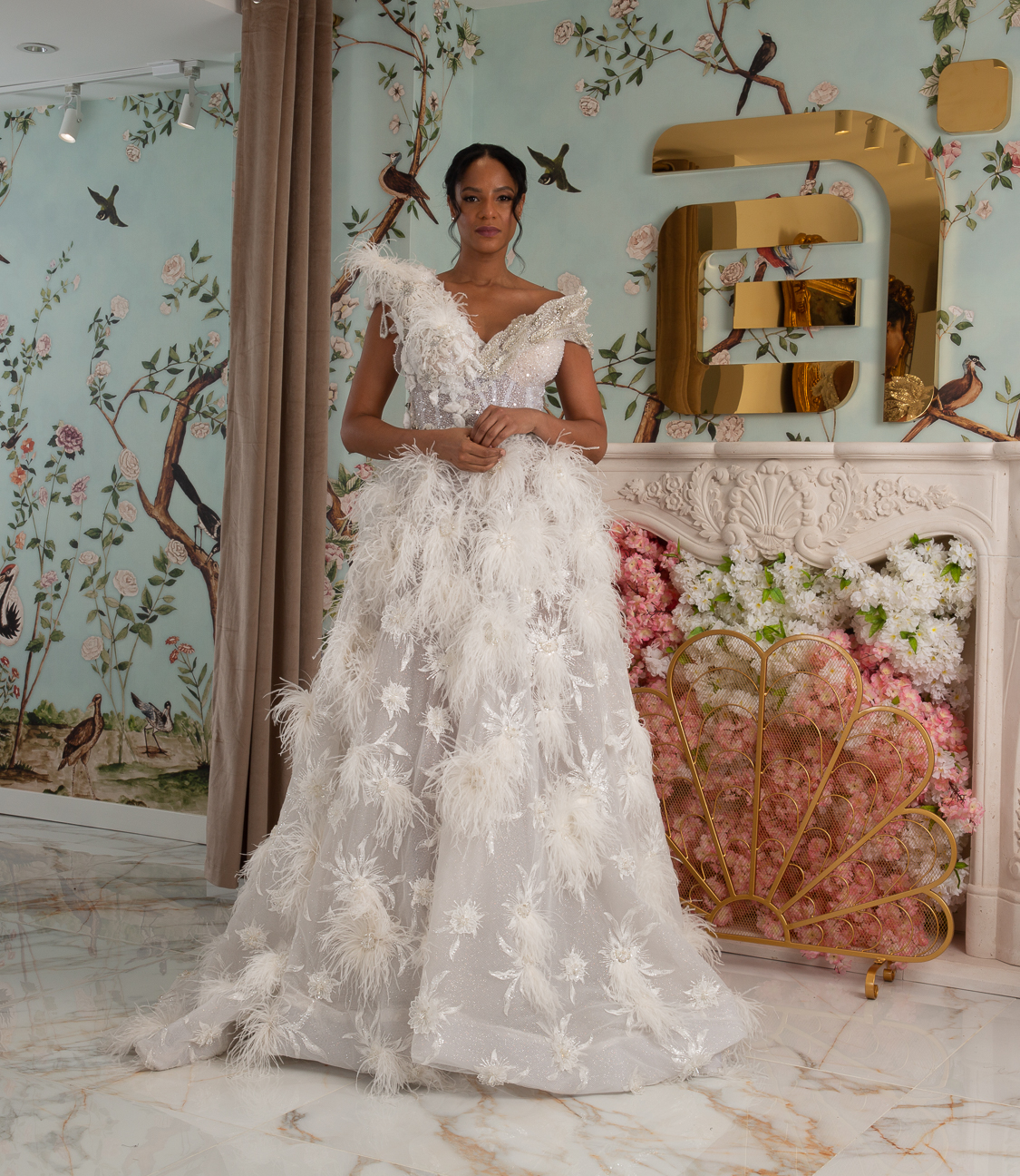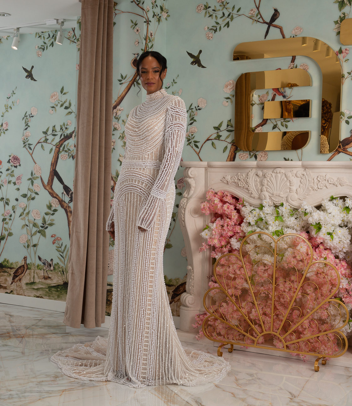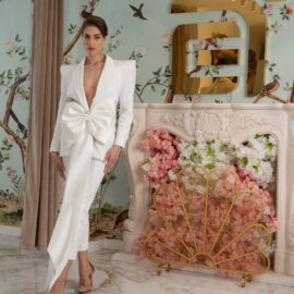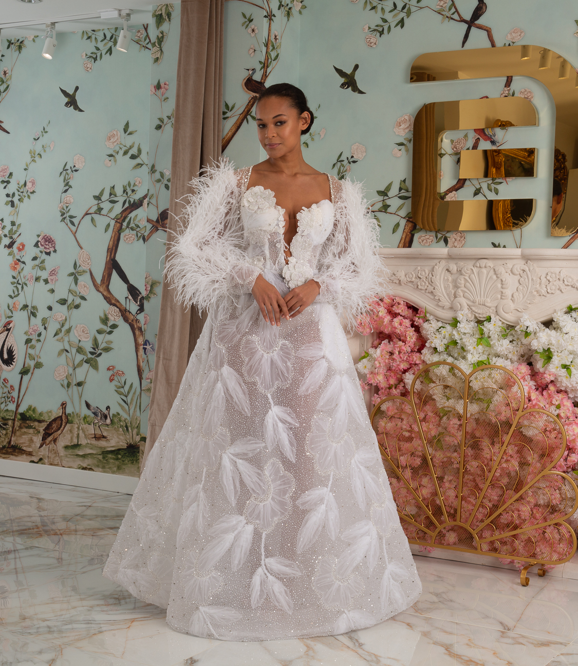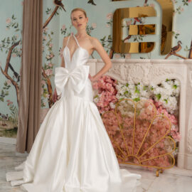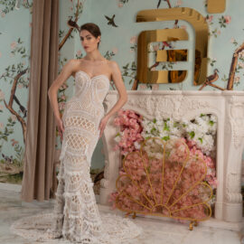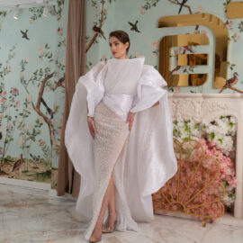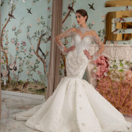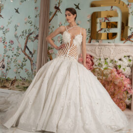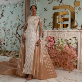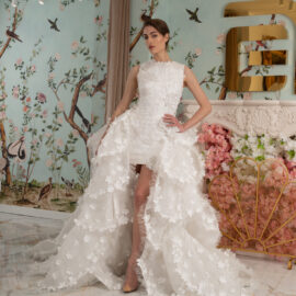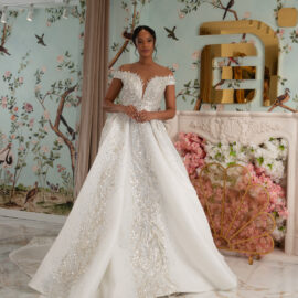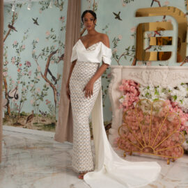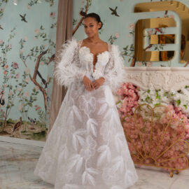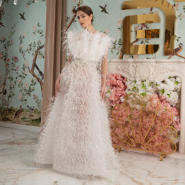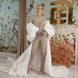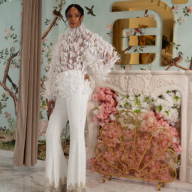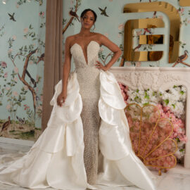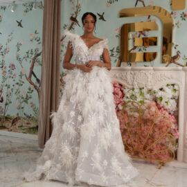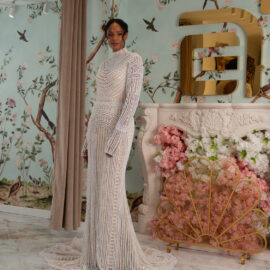 New York Bridal Fashion Week saw the debut of Esé Azénabor’s latest collection, “Essence.” This couture runway collection showcased the designer’s affinity for texture, incorporating fabric manipulation, Swarovski crystals, ostrich feathers, and 3-D floral patterns. The painstakingly hand-beaded pearls added depth and dimension to the gowns, producing breathtaking, one-of-a-kind pieces for brides seeking innovation and originality.