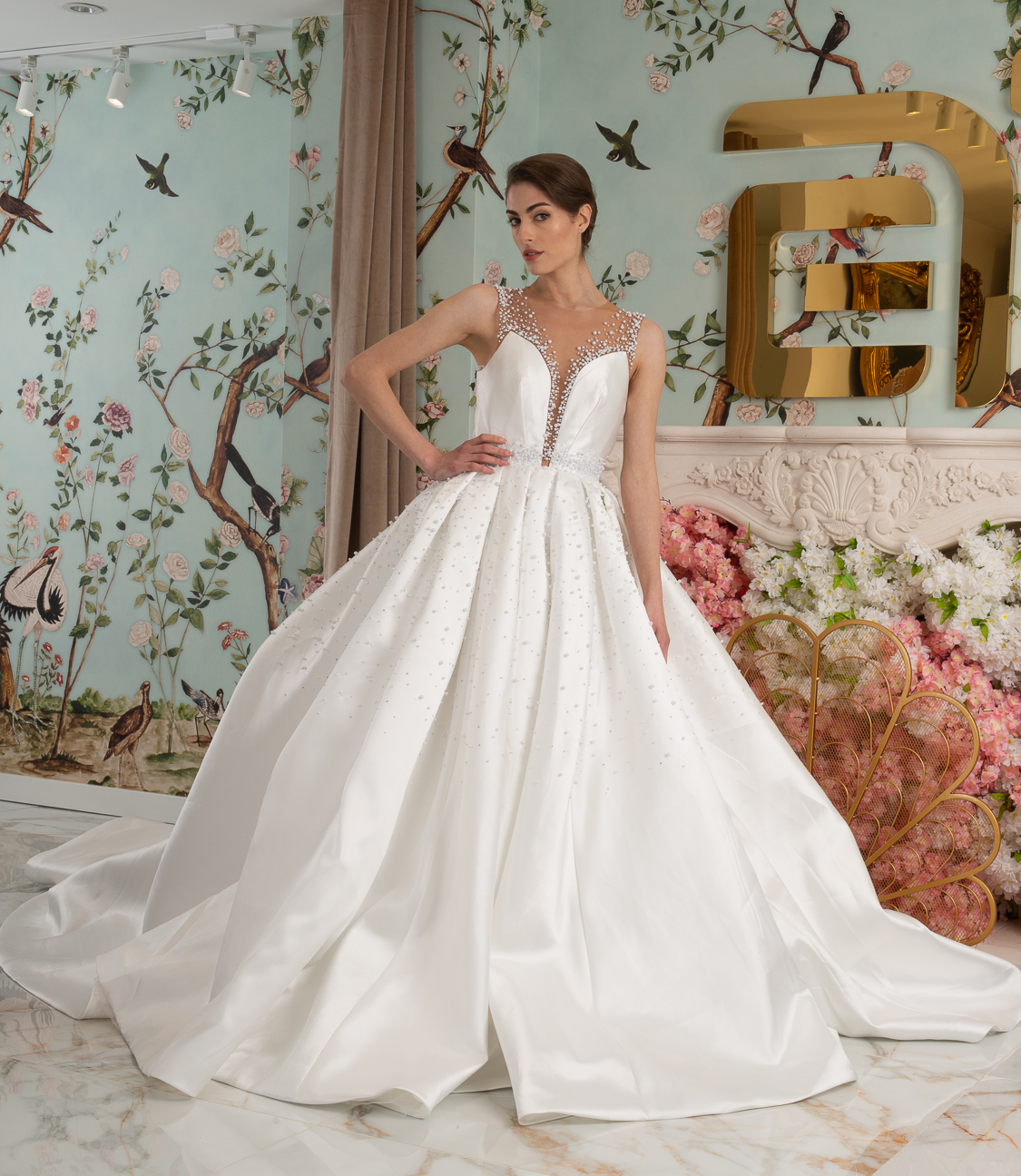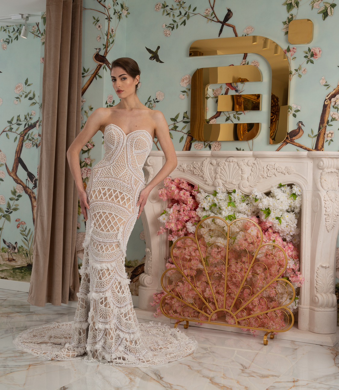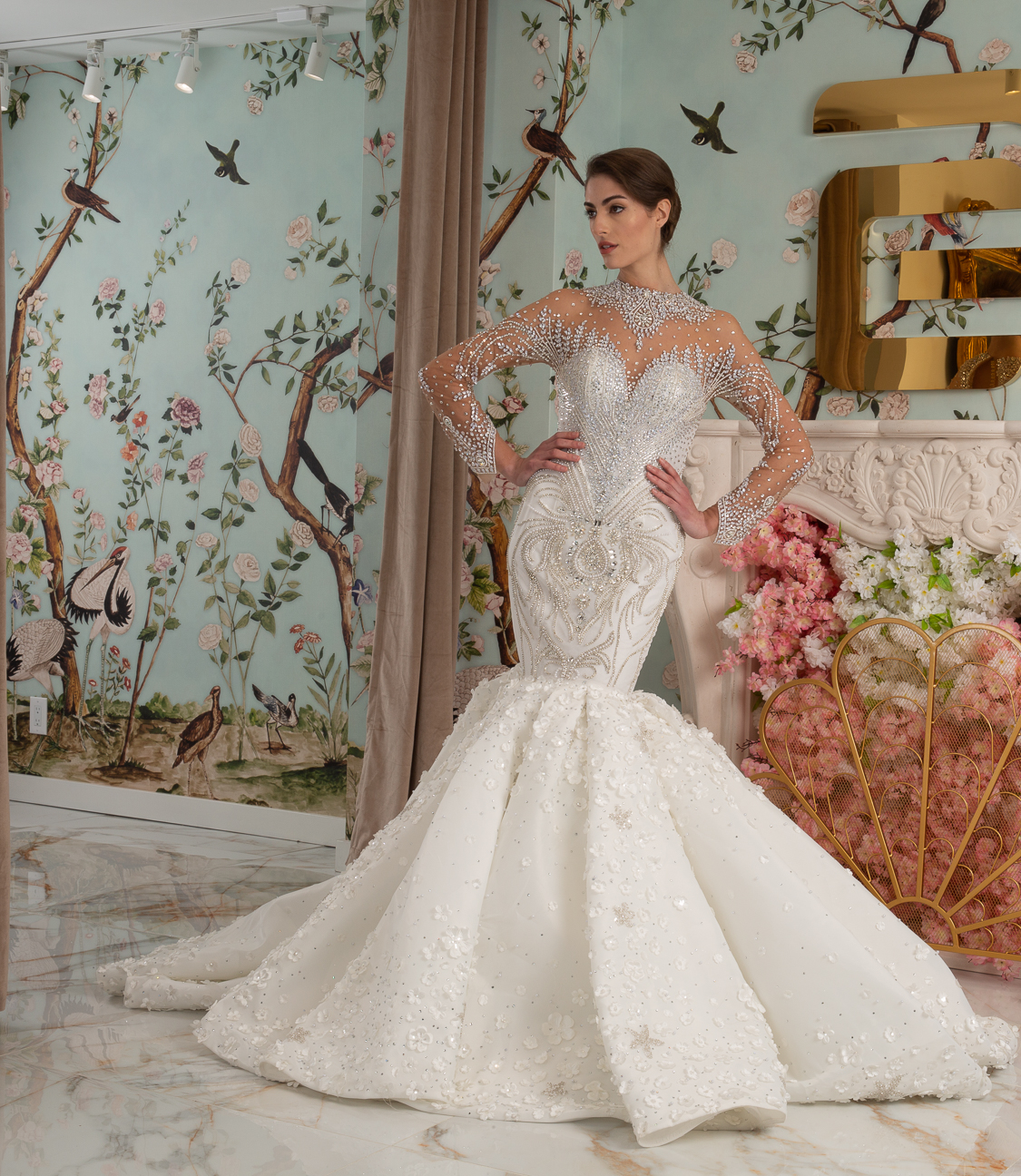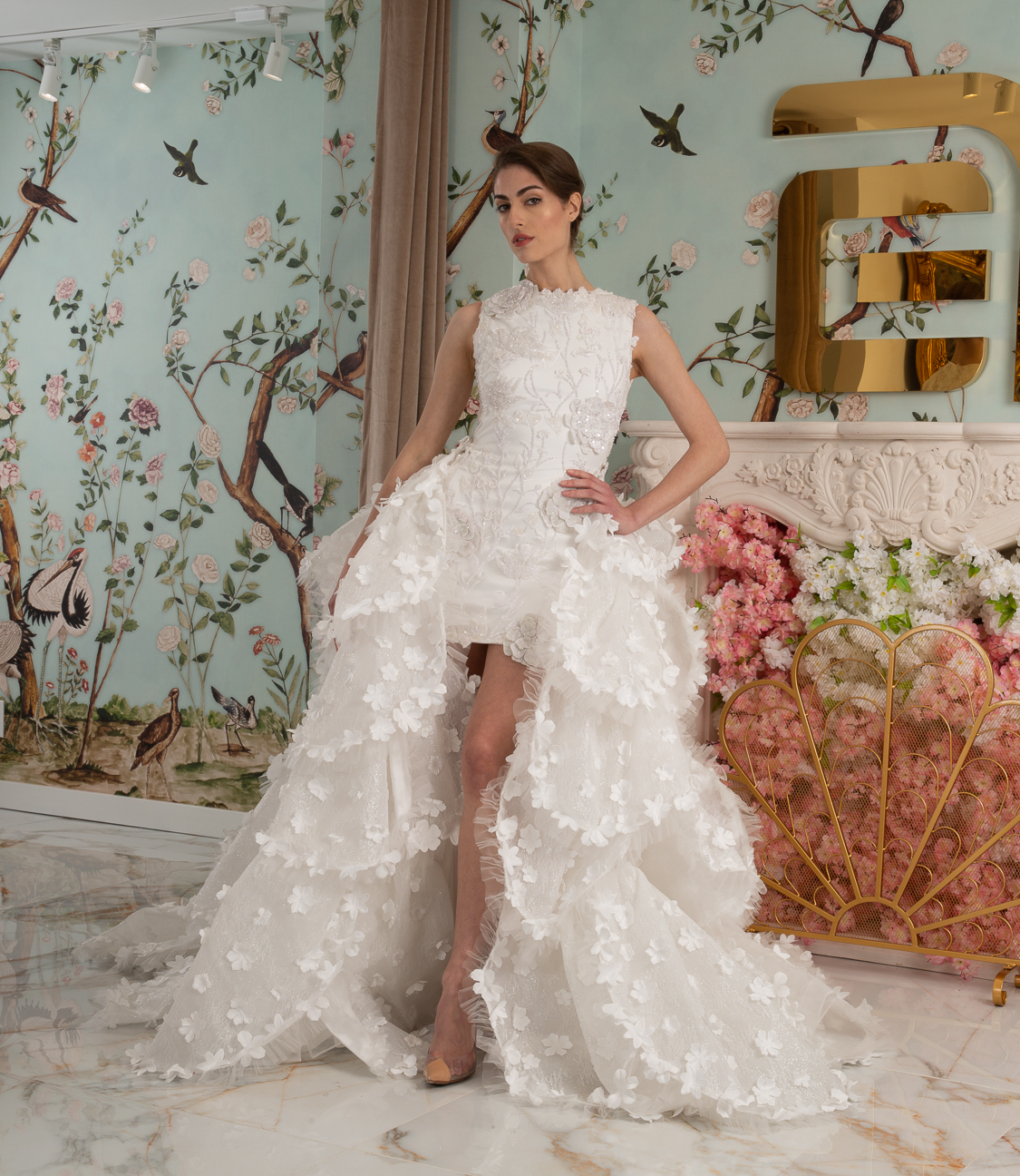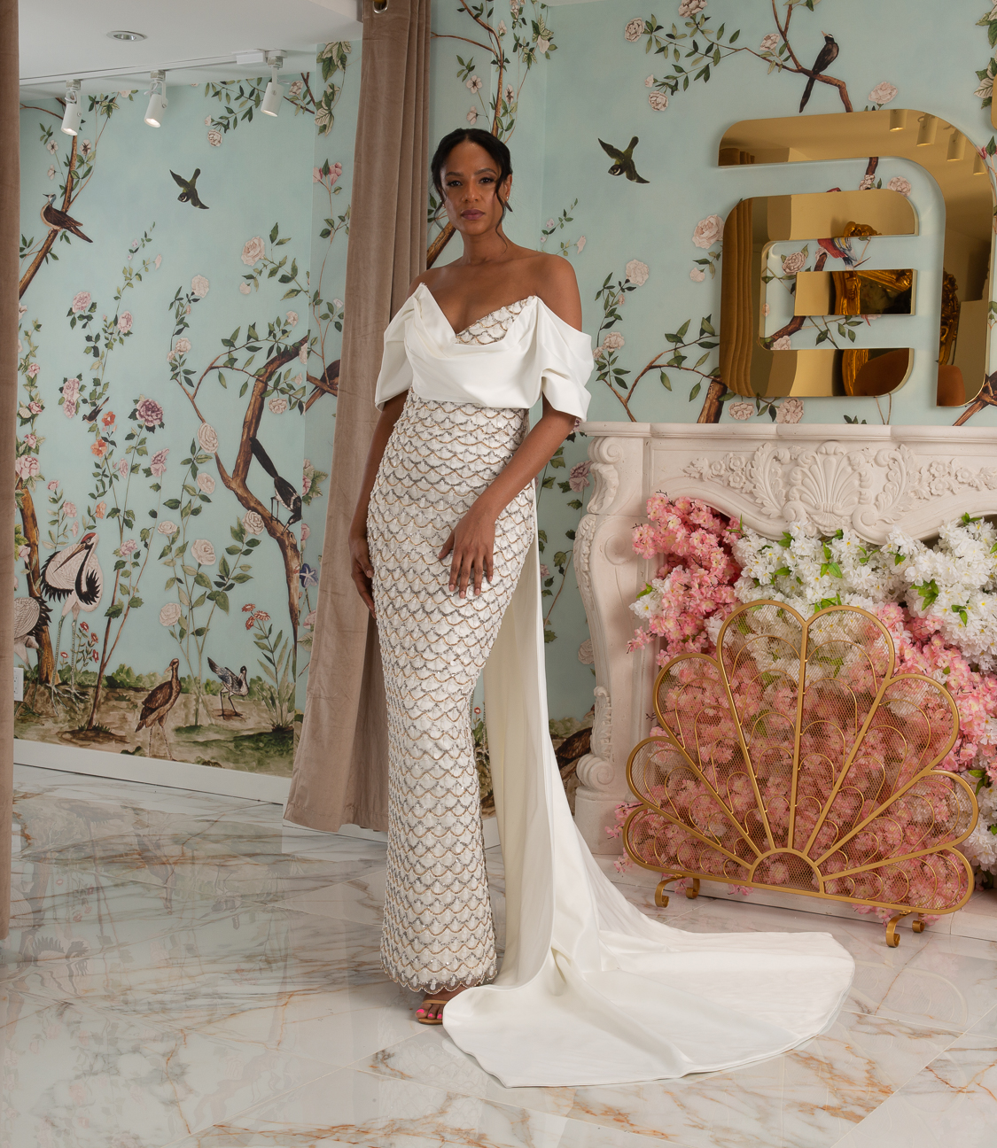 New York Bridal Fashion Week saw the debut of Esé Azénabor’s latest collection, “Essence.” This couture runway collection showcased the designer’s affinity for texture, incorporating fabric manipulation, Swarovski crystals, ostrich feathers, and 3-D floral patterns. The painstakingly hand-beaded pearls added depth and dimension to the gowns, producing breathtaking, one-of-a-kind pieces for brides seeking innovation and originality.