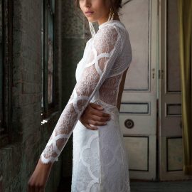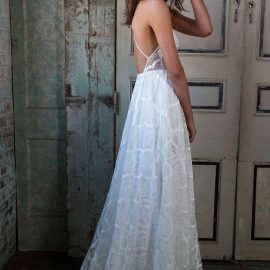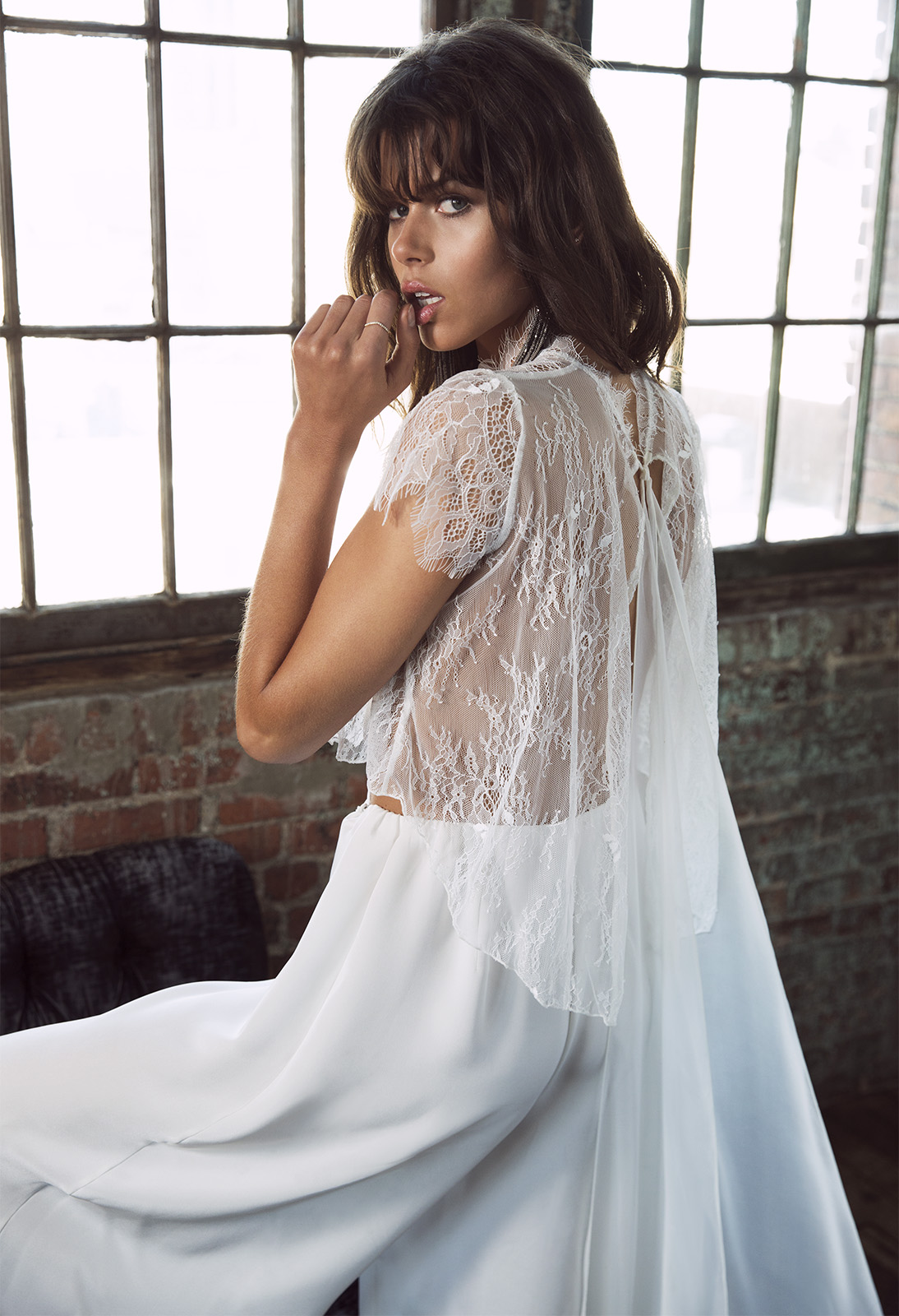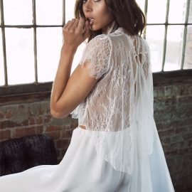The Collection: BLANC offers modern yet feminine shapes handcrafted with a contemporary, geometric printed lace, striking contrast lining all designed to create an enchanting effect on the skin. They are understated, yet unforgettable designs that the modern woman can wear in her own way. Featuring fluid like sandwashed silks and one-of-a-kind capes, handmade with barely there, French Chantilly lace, BLANC allows the bride to have choices, and for her dress to reflect who she isas a woman, both in personality and in style. BLANC represents the girl who is seeking something classic, sophisticated and unique – it’s a collection that will intrigue and delight, not only lace lovers, but the lace skeptics.