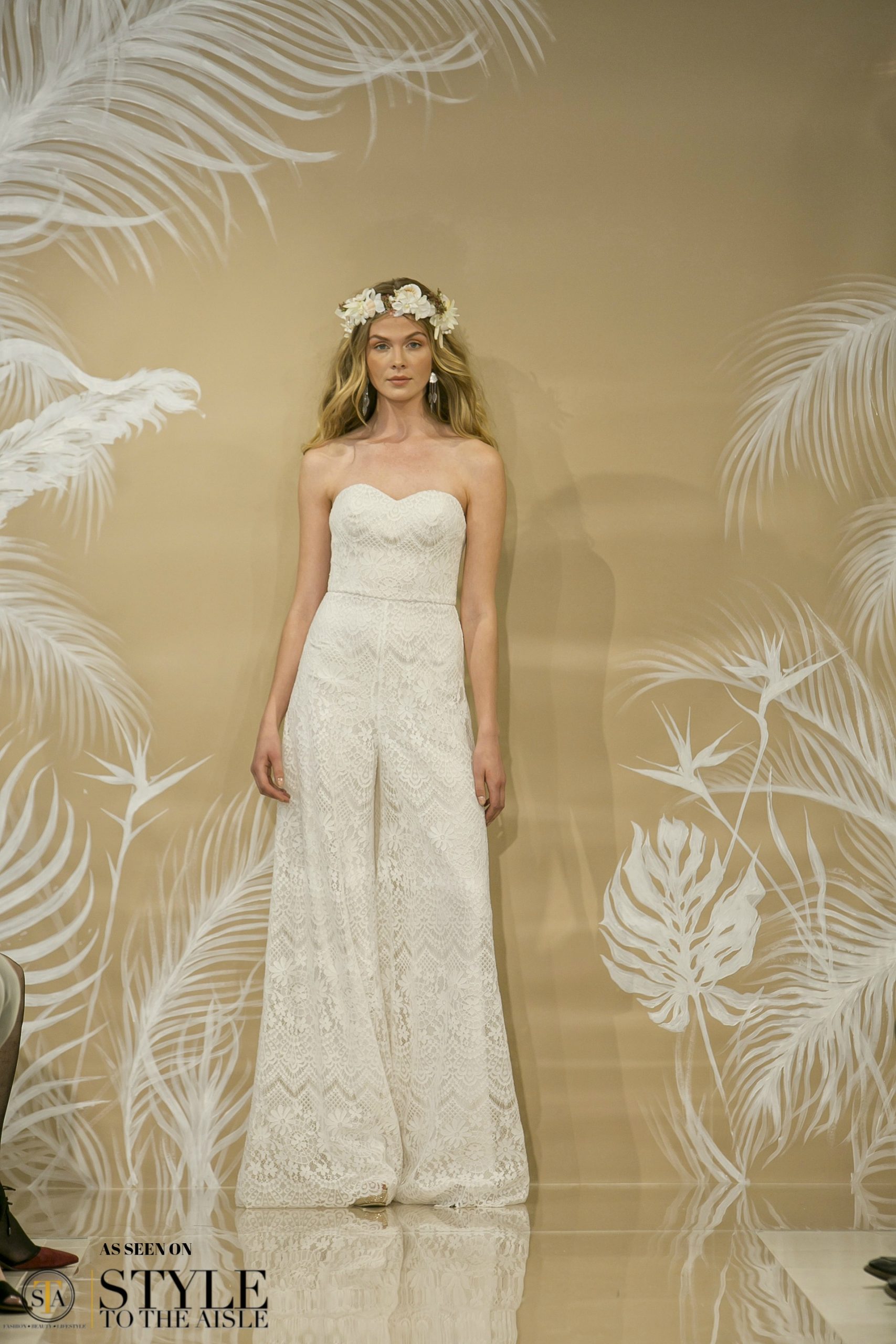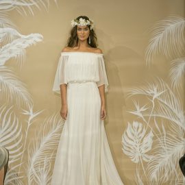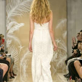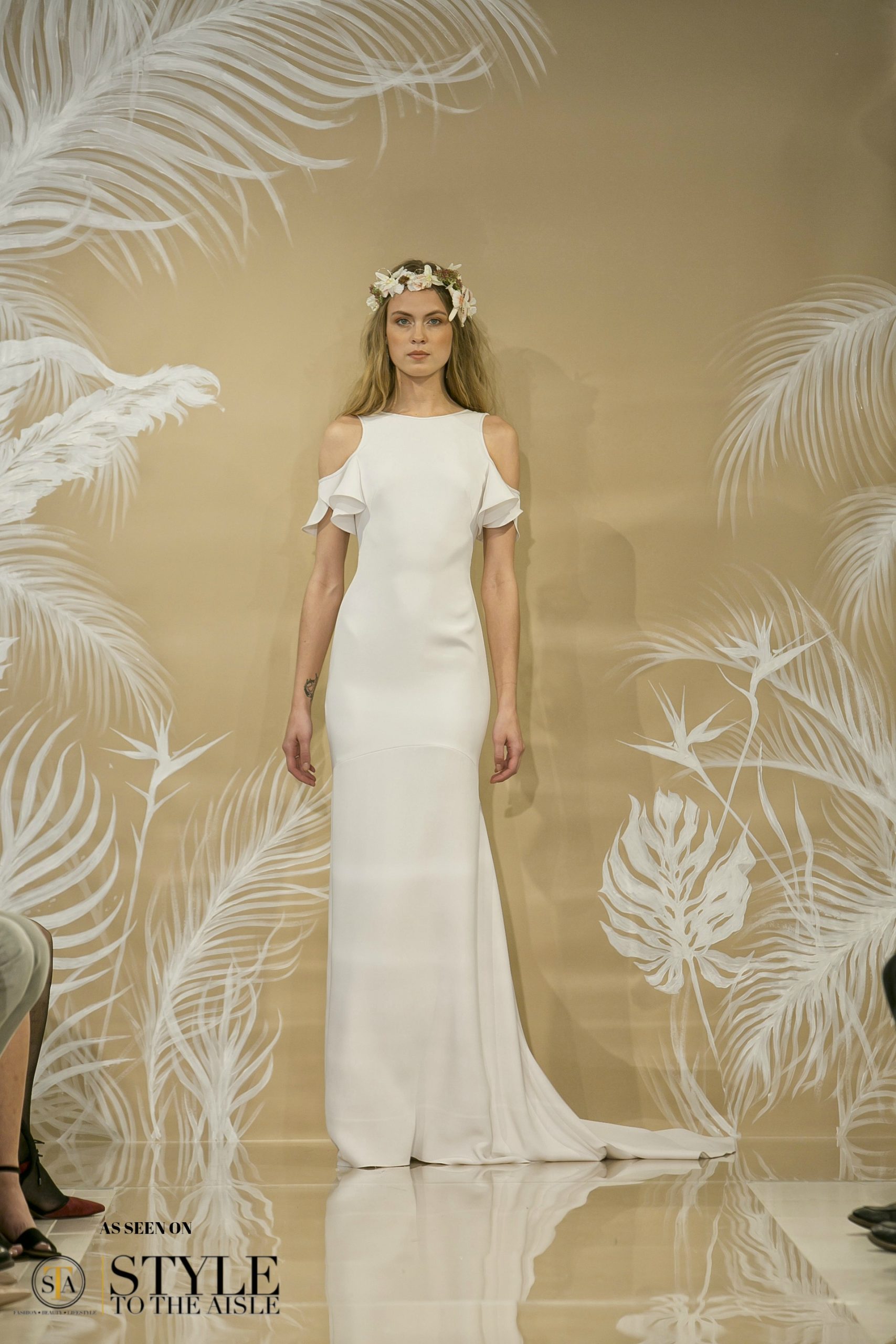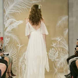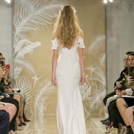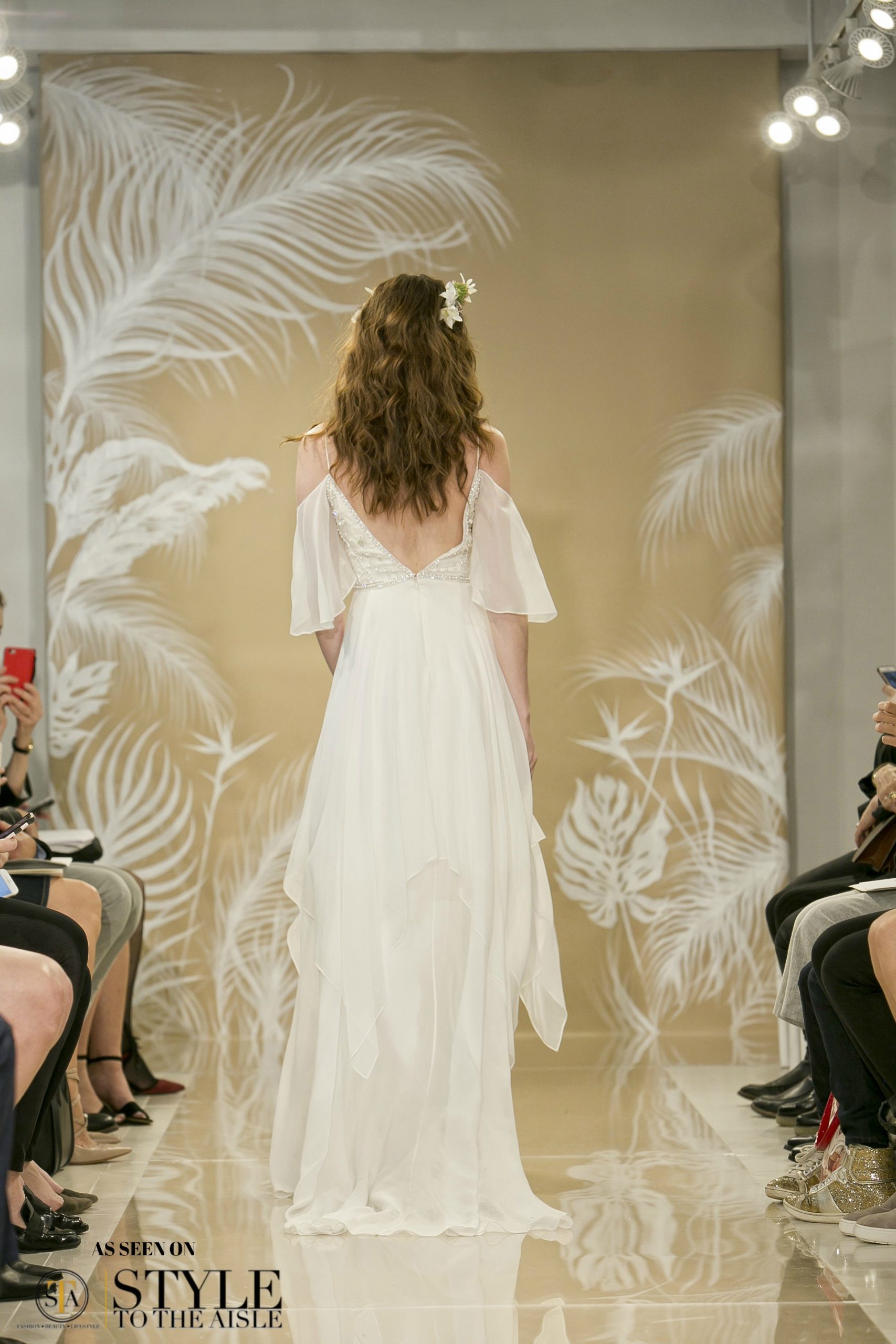 For Fall 2017 the THEIA bridal collection returns to its roots embracing the destination bride. She is escaping the frigid winter cold and heading south to warm tropical islands. She longs for warm sand between her toes and bright lagoon blue waters to form the perfect contrast to her white bridal gown.