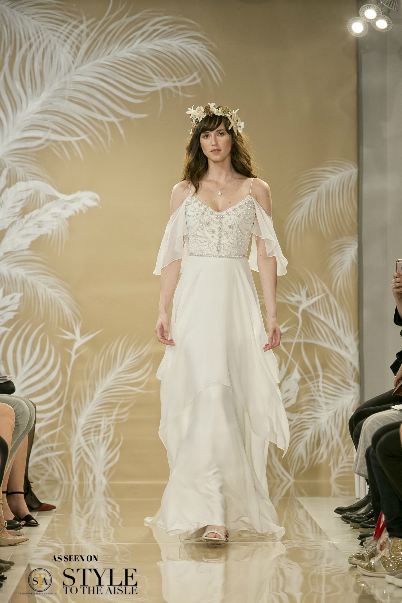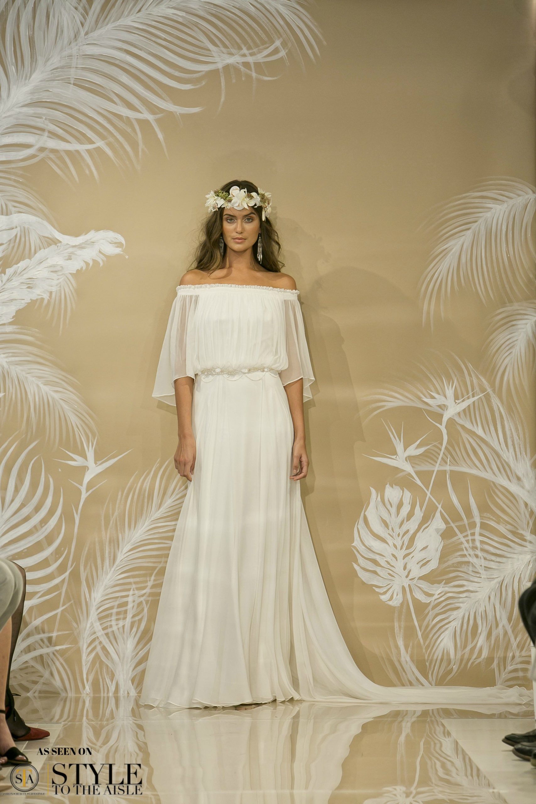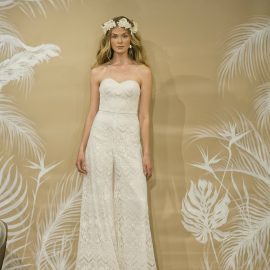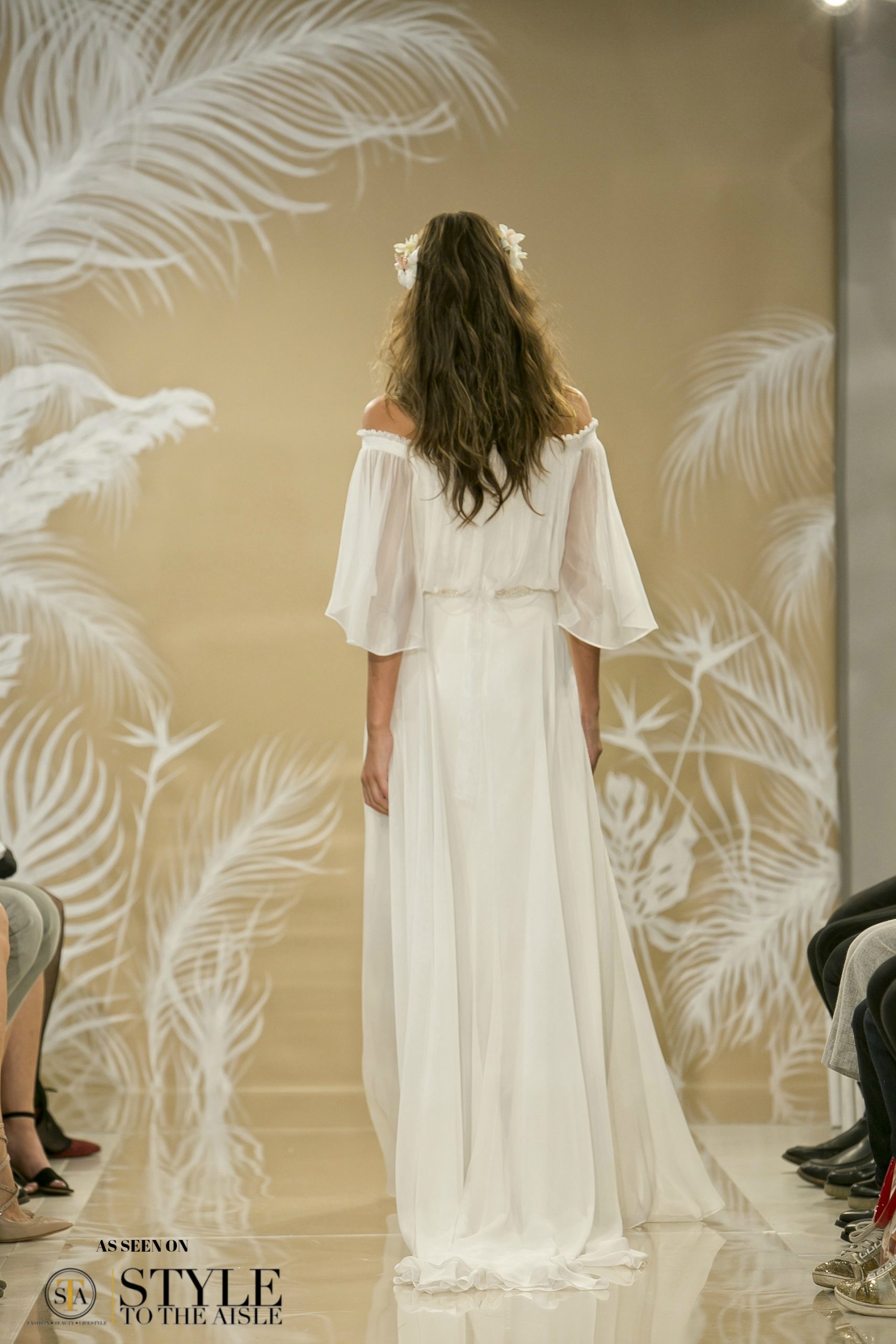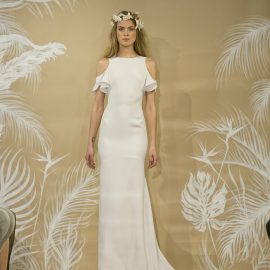 For Fall 2017 the THEIA bridal collection returns to its roots embracing the destination bride. She is escaping the frigid winter cold and heading south to warm tropical islands. She longs for warm sand between her toes and bright lagoon blue waters to form the perfect contrast to her white bridal gown.