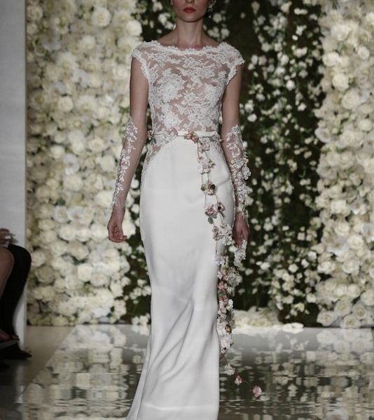 Reem Acra’s newest bridal collection puts a twist on the classic full ball gown and brings it up to date, complete with embroidered skirts, sheer illusion necklines and lace corsets. Crop tops with sleeves ranging from long lace ones to satin cap styles, each paired with a full skirt. Nude lace bodices were seen throughout the collection with crystal and beadwork detailing, adding glimmer to the barely there fabric.