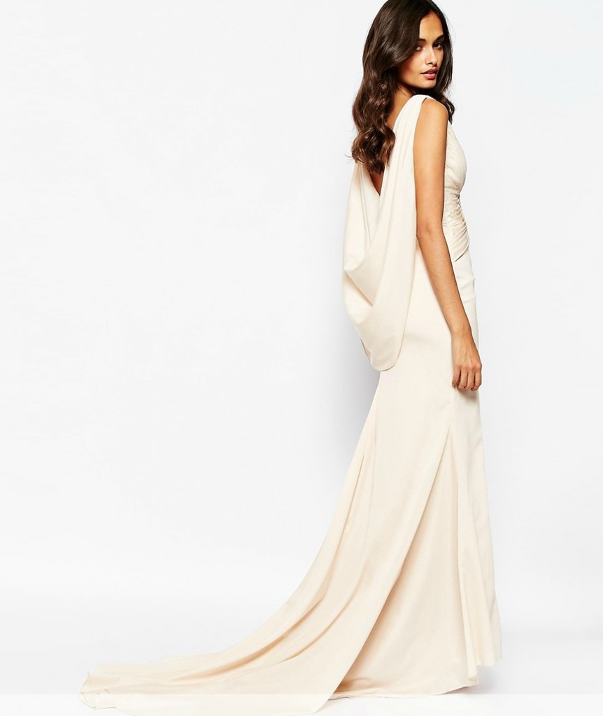 Looking for a knock-out wedding gown without breaking the bank? We’ve found the perfect gown for that budget conscious bride that wants to wow your guests and still have money to spend on those must-haves for the reception. Asos has released a $316 wedding dress that is elegant and timeless. This v-neck gown with a fishtail hemline, features a oversize cowl back and the train adds an element of drama.