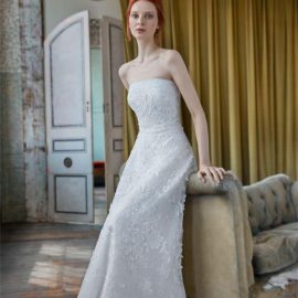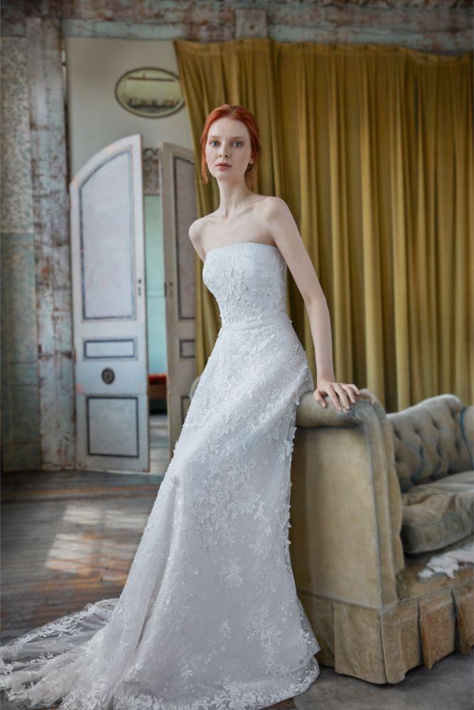 "Jacqueline" strapless column wedding dress with floral lace appliqués.