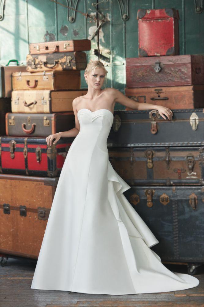 "Gabrielle" strapless wedding dress with deep V-neckline.
