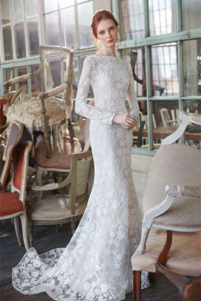 "Halette" lace wedding dress with 3-D floral appliqués, high neckline, and long illusion sleeves.
